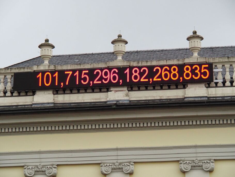 Электронное табло с невероятно длинной цифрой, которая увеличивается с каждой секундой, в реальном времени показывает сумму долга правительства Австралии перед аборигенами.