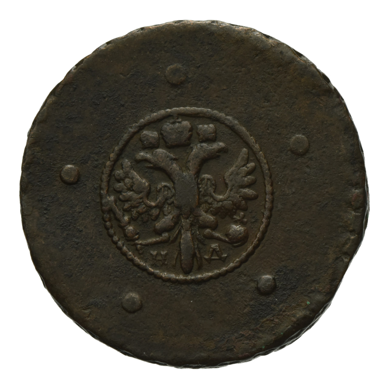 Это монета со счетными точками. Сначала стоимость денег определялась по весу. Потом для ее обозначения стали использовать символы, буквы, слова и цифры. Или, например, счетные точки — небольшие выступы, углубления или точки на монете, которые показывали ее ценность в разные времена. Такие точки можно найти на монетах еще с древних времен в Европе, в том числе они встречаются на монетах XVIII века Российской империи, чтобы неграмотные люди по этим точкам могли определять на ощупь, сколько стоит монета.