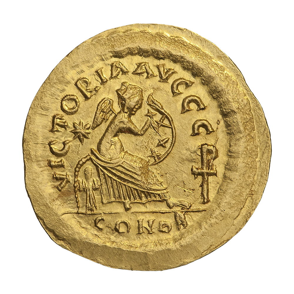 Впервые христианские символы появляются на монетах Византии. Знамение победы в виде монограммы Божественного имени из букв Х и Р было явлено Константину накануне решающей битвы за Рим с узурпатором Максенцием в 312 году. С этого времени христограмма станет одним из самых популярных символов новой веры. Со временем на монетах появится крест, а также образы Христа, Богородицы и святых.