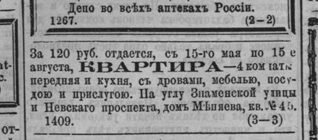 На рубеже XIX–XX веков квартиры чаще всего искали, как и сегодня, по объявлениям. В Петербурге выходило огромное количество газет с рекламными объявлениями; не так, конечно, удобно, как сегодня с интернетом, но тоже довольно легко.