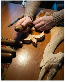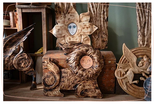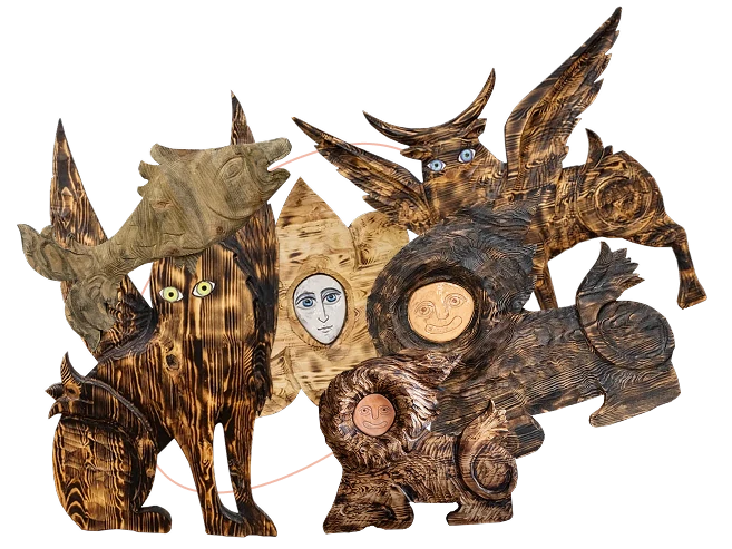 Совместное творчество семьи началось с участия в выставках. Удивительное сочетание резьбы по дереву и керамики воплотилось в образах мифологических существ, природных явлениях и древних сказочных мотивах.