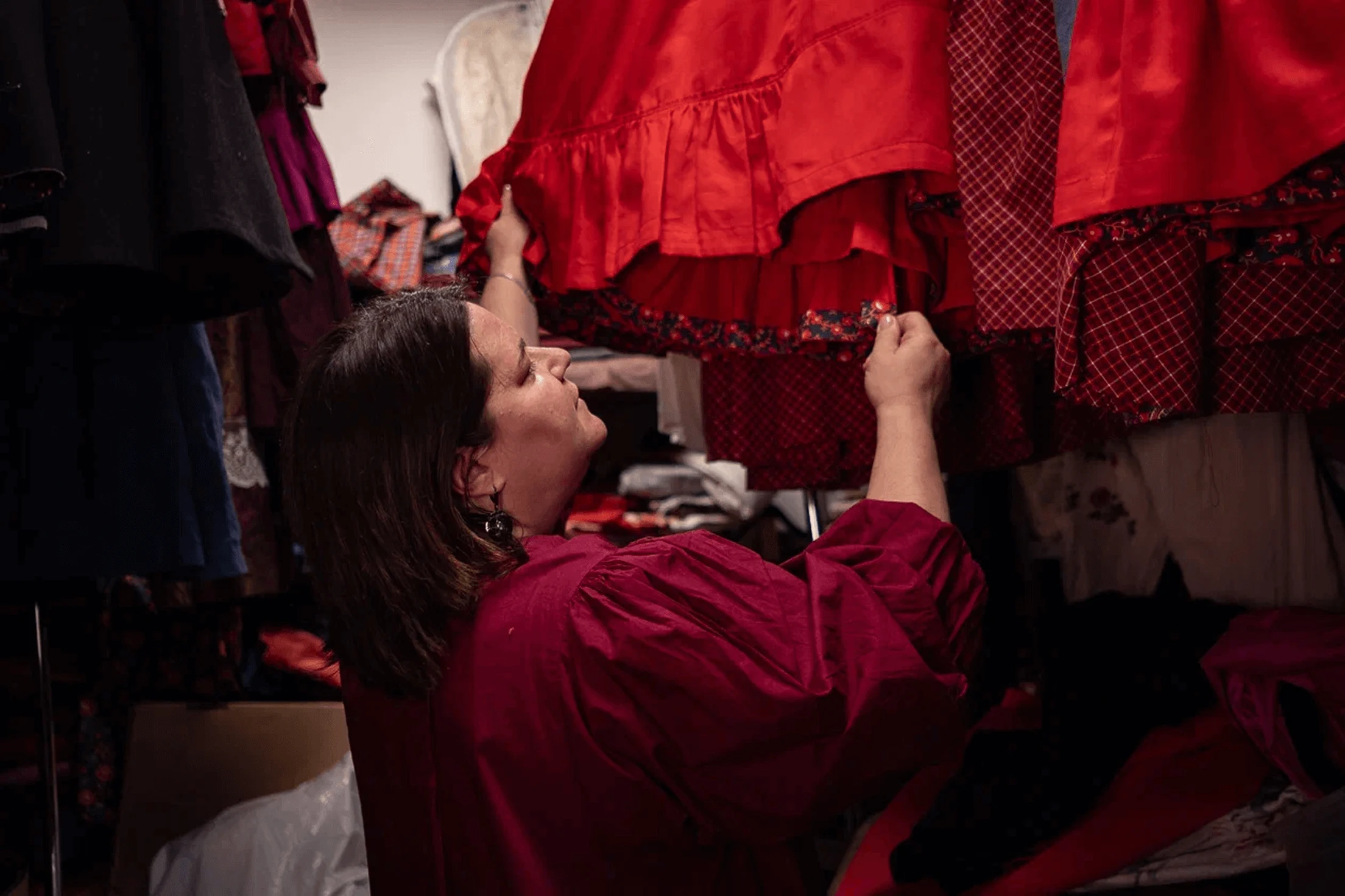На полках мастерской Юлии современные ткани соседствуют со старинными штофами, дутыми пуговицами и золотными шнурами. Мастерица не терпит, когда костюмы переосмысляют в дешевой ткани. Красота современного традиционного костюма в том, что для нас он такая же драгоценность, как и раньше, когда одевался только по праздникам.