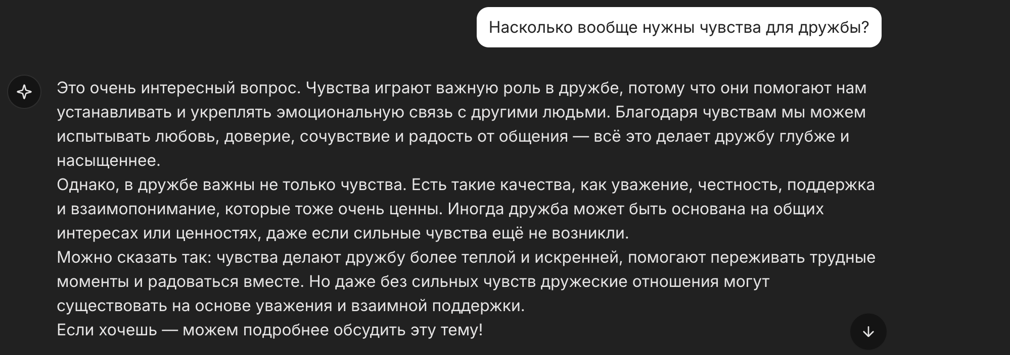 После попытки уточнить у текстовой машины, какие все-таки качества дружбы важны, если вычесть эмоциональную близость и жизненный опыт, мой нейросетевой друг ничего не отвечал несколько минут, а затем выдал системную ошибку. Больше я его не тревожил.