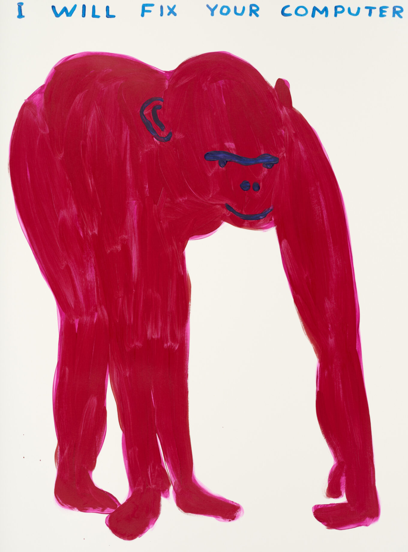 Хотя порой вовсе невозможно определить, что художник имеет в виду. На картине I will fix your computer (2022) изображена обезьяна с надписью «Я починю твой компьютер». Где здесь смысл? Вероятно, его нет — в этом заключается концепция постиронии.