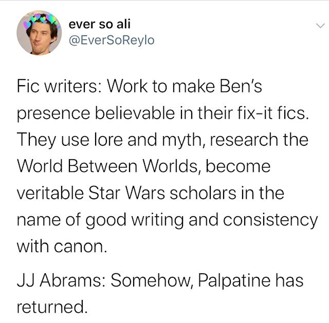 Мультивселенные, внезапно появляющиеся во франшизах путешествия во времени, которых раньше не было, втиснутые в сюжет волшебные и фантастические гаджеты открывают возможности для бесконечного воскрешения популярных персонажей. Иногда авторы даже не затрудняются придумать для этого хоть какое-то оправдание. Печально знаменитая фраза об императоре Палпатине, который «как-то вернулся» в фильме «Звездные войны: Скайуокер. Восход», превратилась в мем. В соцсетях отмечают, что авторы фанфикшена проводят большую работу по воссозданию достоверного мира в каноне, чем профессионалы, ответственные за мультимиллионные франшизы.