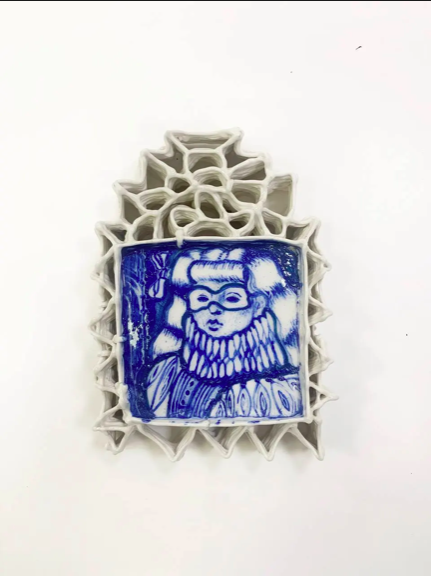 Это работа авторства Анастасии Андреичевой «Дитя» из серии «Керамические картинки». Петербургская художница, выпускница кафедры художественной керамики Академии им. А. Л. Штиглица. В творчестве Анастасия исследует тему восприятия, наблюдения за людьми и собственными переживаниями об эфемерности, о хрупкости и об относительности глобальной и будничной оценки мира. Обращается преимущественно к языку керамики, фарфора и бумажного фарфора, исследуя собственные технологические подходы в керамике