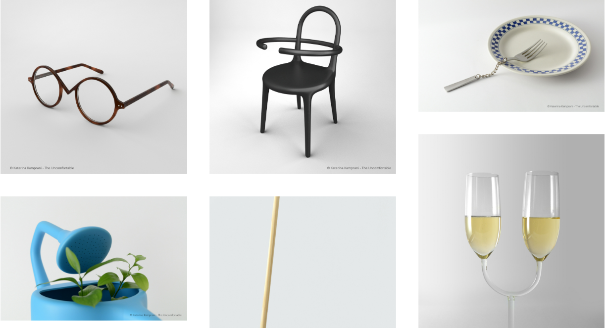 В интернете много материалов, посвященных рациональному распределению пространства, правильному подходу к тратам и другим «взрослым» темам. Наверное, творческие люди устают от чрезмерной «серьезности» окружающих. Например, афинский архитектор Катерина Кампрани в противовес этому создала виртуальную коллекцию неудобных и (внешне) бесполезных предметов.