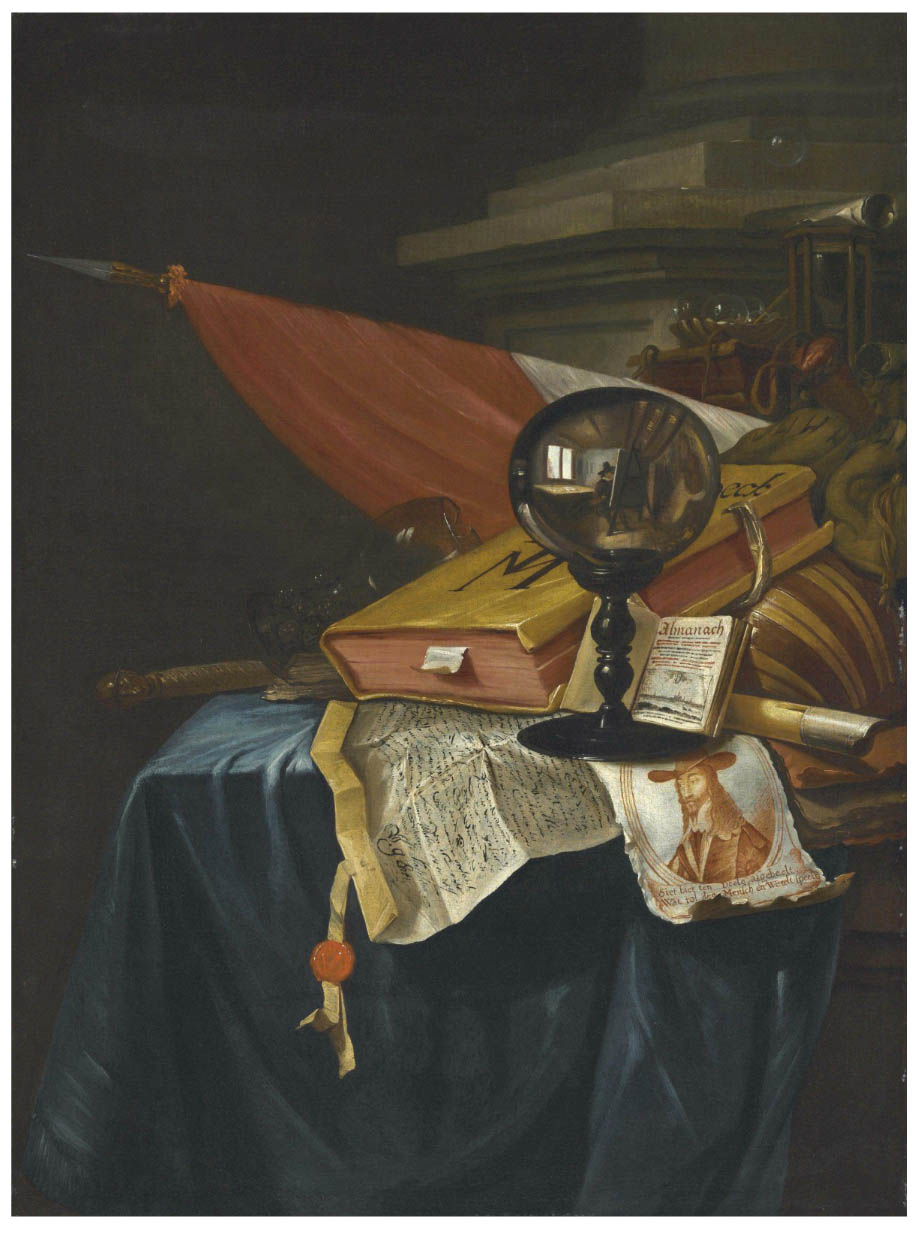 - Тема познания, значение науки и искусства. Географические карты, астролябии, музыкальные инструменты и ноты, предметы для письма и прочие атрибуты творчества и учености символизировали интеллектуальную меланхолию, как на одноименной гравюре Альбрехта Дюрера. Книги, согласно классификации шведского искусствоведа Ингвара Бергстрома, относятся к объектам преходящий значимости и в то же время — к объектам, отображающим созерцательную жизнь. В отличие от символов богатства и физических наслаждений книга занимала высокое место в иерархии ценностей ванитас, символизируя логику мироздания, противопоставленную хаосу. «Книга в окружении предметов искусства символизирует упорядоченность мироздания, единство всех его элементов, риторический принцип „отражения всего во всем“», — пишет книговед Юлия Щербинина. Предметы интеллектуального наследия, хотя и настраивают на меланхолический лад, воплощают идею творческого бессмертия, продолжения жизни человека в том, что он создал.